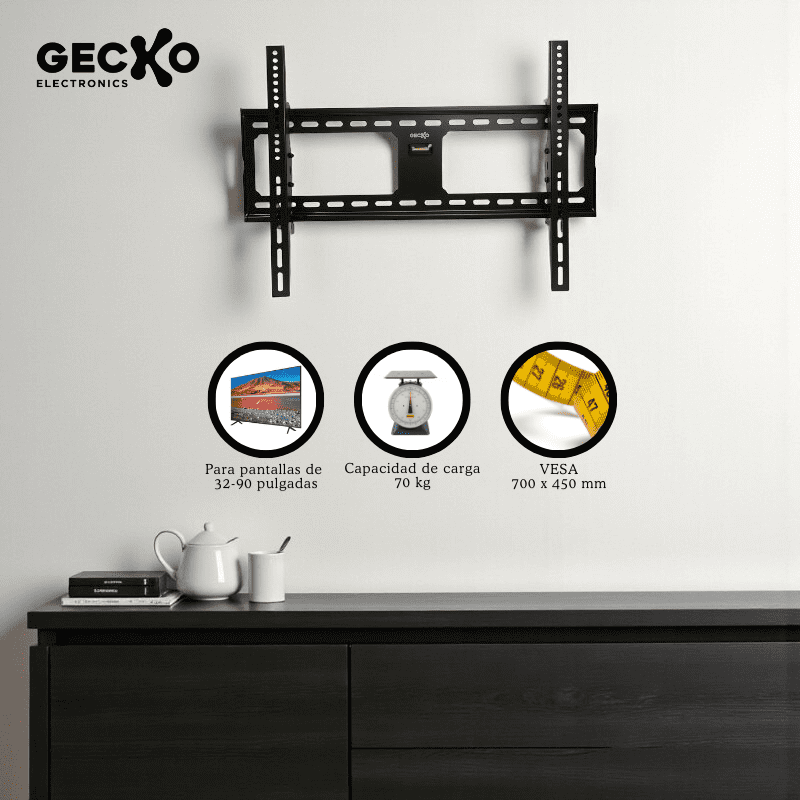 Soporte Fijo con Inclinación Gecko Electronics modelo GK-T90, diseñado para pantallas de 32 a 90 pulgadas. Su estructura de acero de 3 mm de grosor ofrece máxima resistencia y durabilidad, asegurando que tu televisor permanezca siempre en la mejor posición.