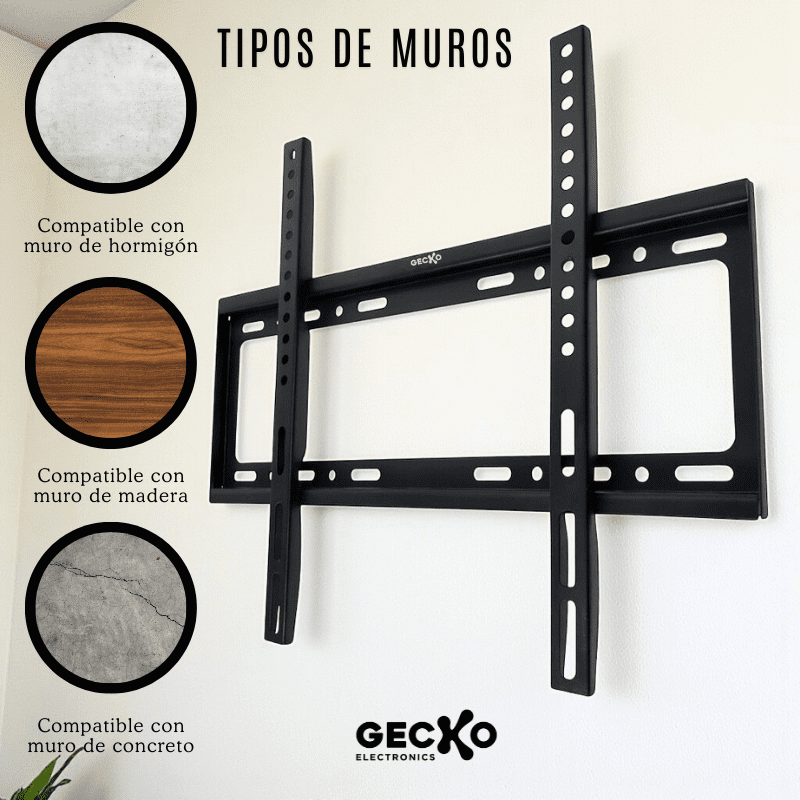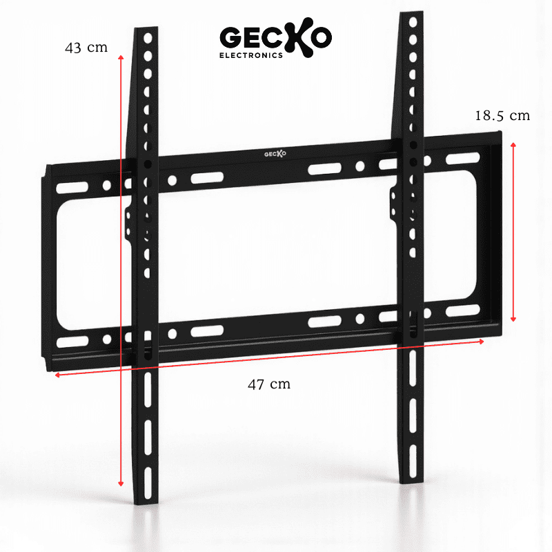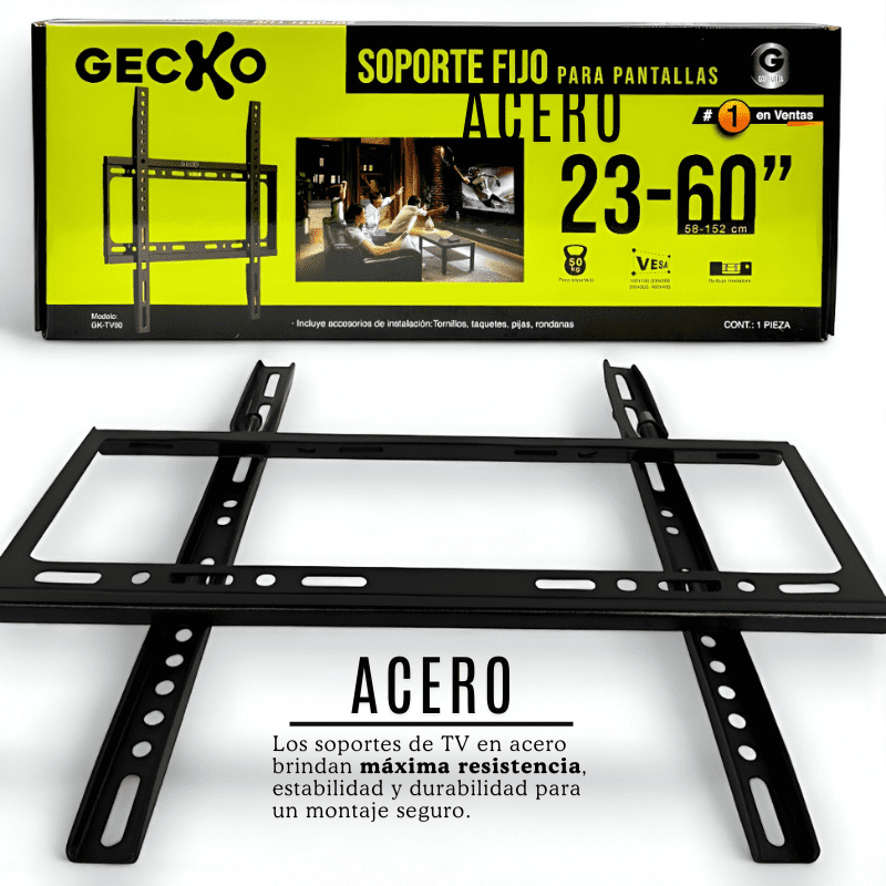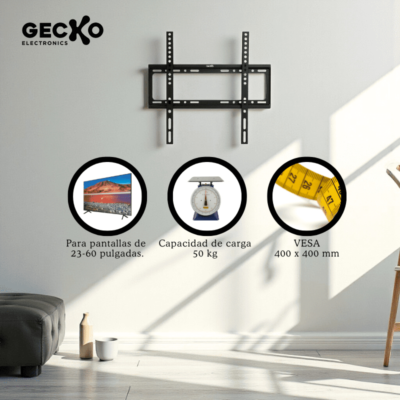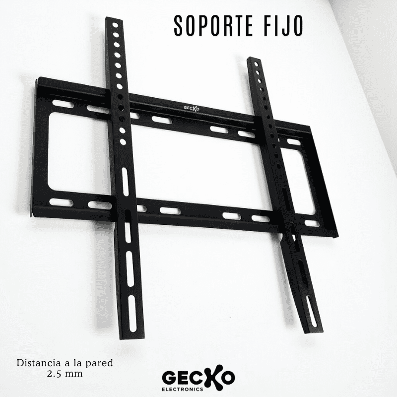 Soporte Fijo Gecko Electronics, diseñado para pantallas de 26 a 60 pulgadas. Fabricado en acero al carbono de 3 mm de grosor, ofrece una resistencia superior y garantiza que tu TV permanezca estable en todo momento.
